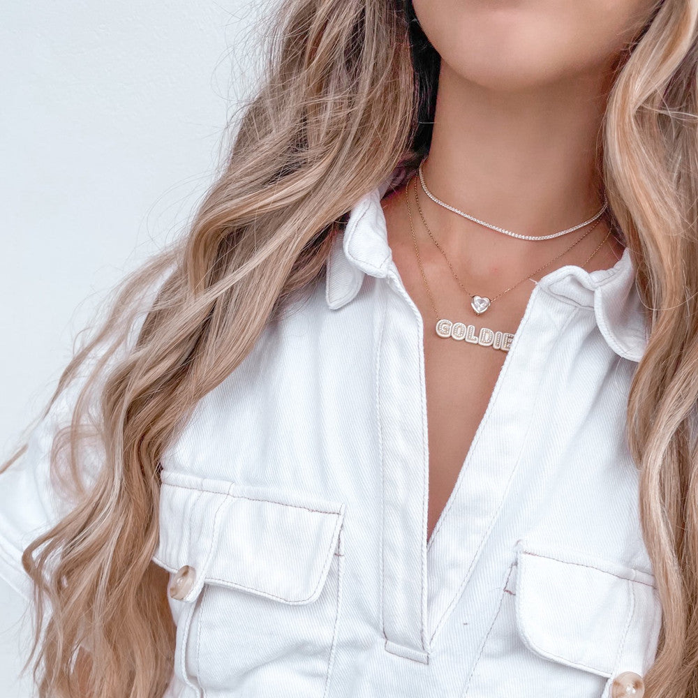 Add the perfect pop of color to your new favorite custom design. Each customization is outlined with precision cut crystals to give each necklace a dazzling shine. Processed and plated with 18K gold, rose gold, or platinum for you to choose from. Perks? You'll never have to worry about this necklace tarnishing or losing its quality.