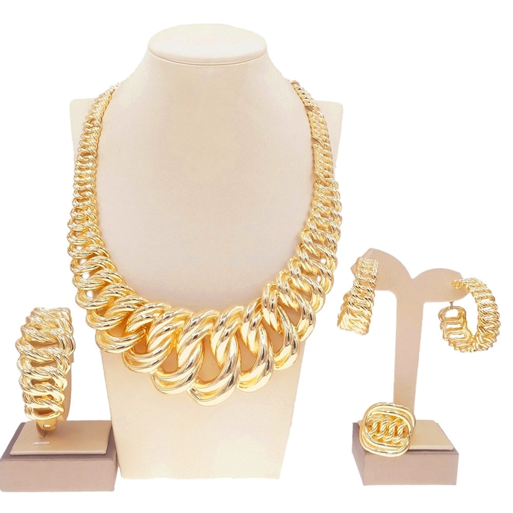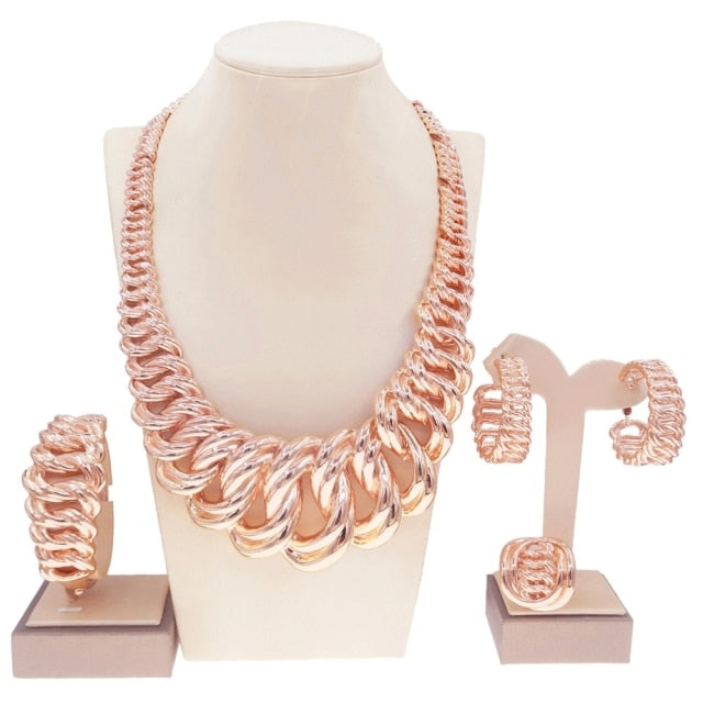The perfect gilded and edgy touch to your next night look. Accessorize with this glamorous chunky set and stun the crowd. Each set is plated with high-quality 18K gold, rose gold, or platinum over 304 stainless steel. Afterwards, each piece is polished to a pristine shine. Best part? You'll never have to worry about this set tarnishing or losing its quality.