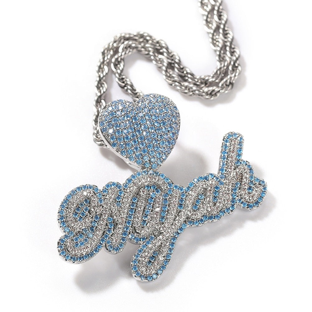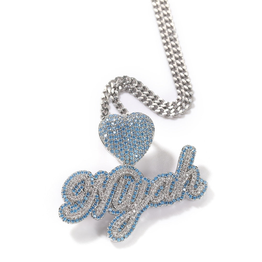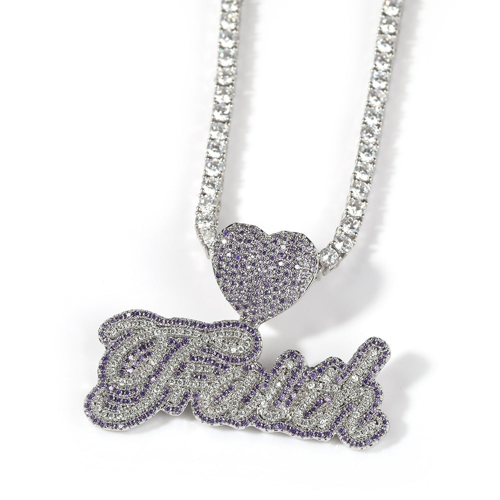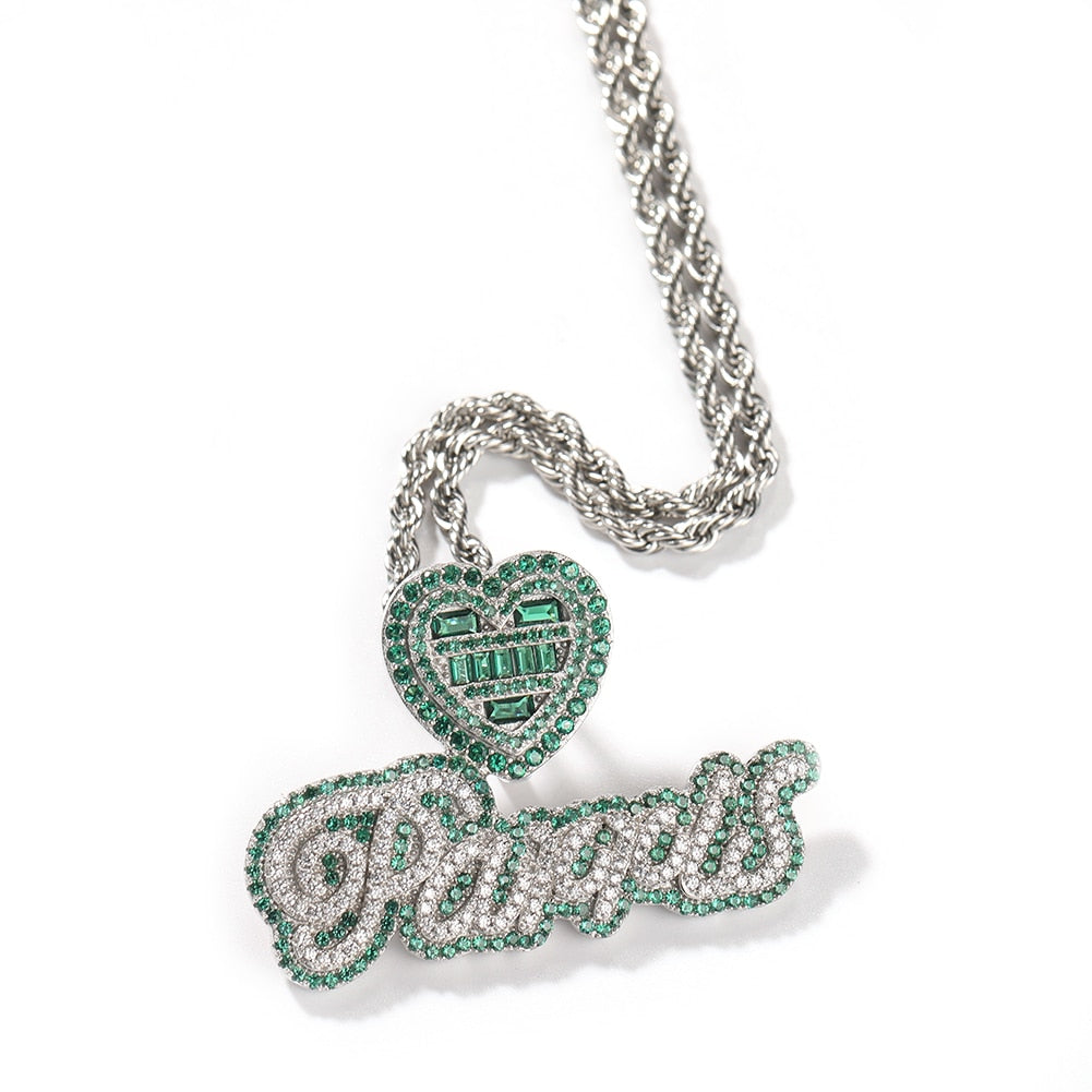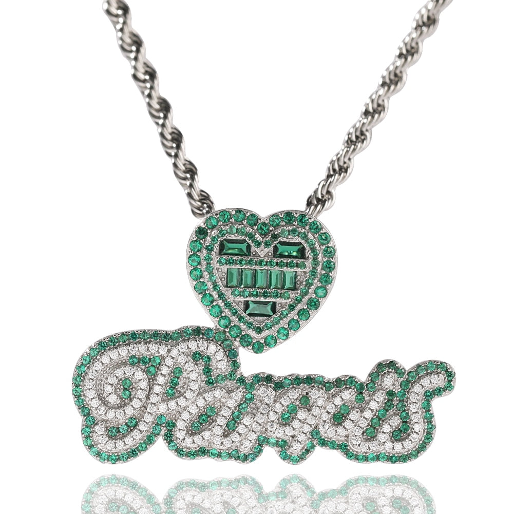 Personalize this platinum crystal choker with any name 10 letters or less. This design features a brilliant heart pedant delicately set with green, purple, or blue precision cut crystals for you to choose from. This dazzling masterpiece is hand polished to a pristine shine and sure to catch any eye. Choose from the 3 chain types below.