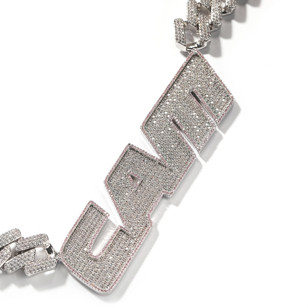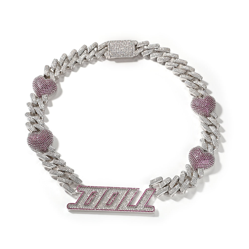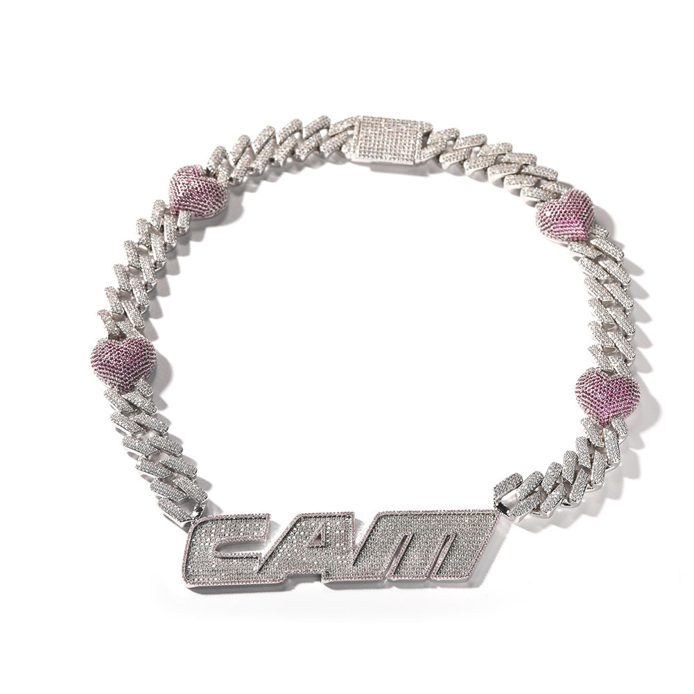 Personalize this luxury chain with any name or phrase 8 letters or less. Customize this design in 18K gold, rose gold, or platinum. Each necklace is set with heart-shaped precision cut crystals and hand polished to a pristine shine.