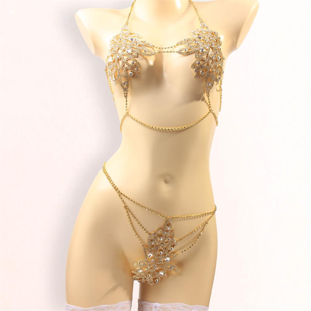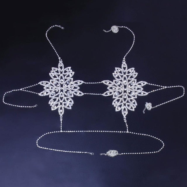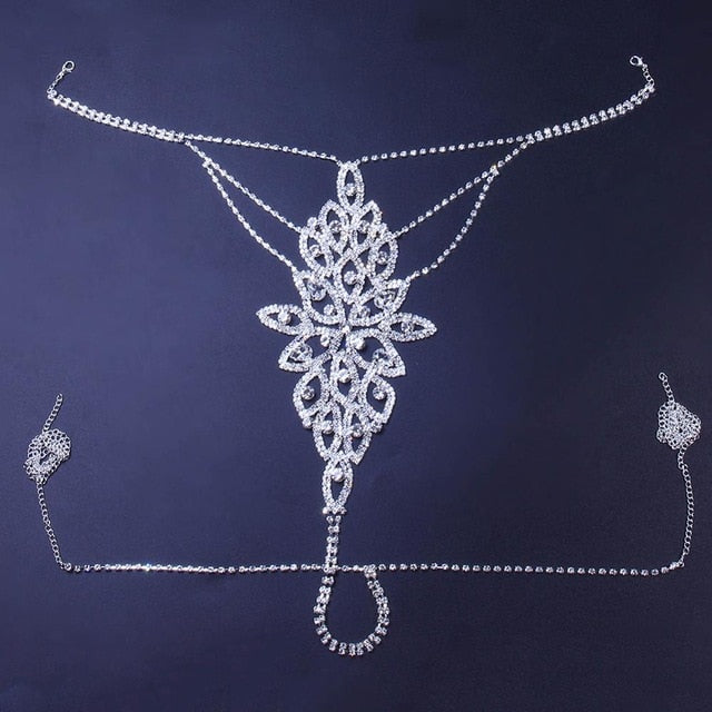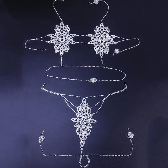 Leave them mersmerized with this set muse. Embellished with high quaity crystals and rhinestones, this lingerie set is sure to be unforgettable. This sexy addition to a private or public rendezvous will certainly create dazzling memories. Equipped with an adjustable 36 inch bust chain and two 44 inch waist chains, this sexy two piece is sure to be comfortable and stylish.