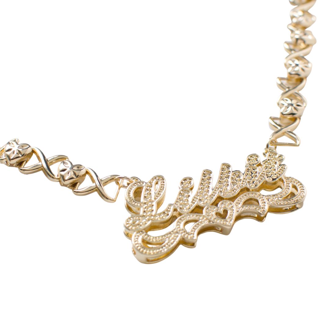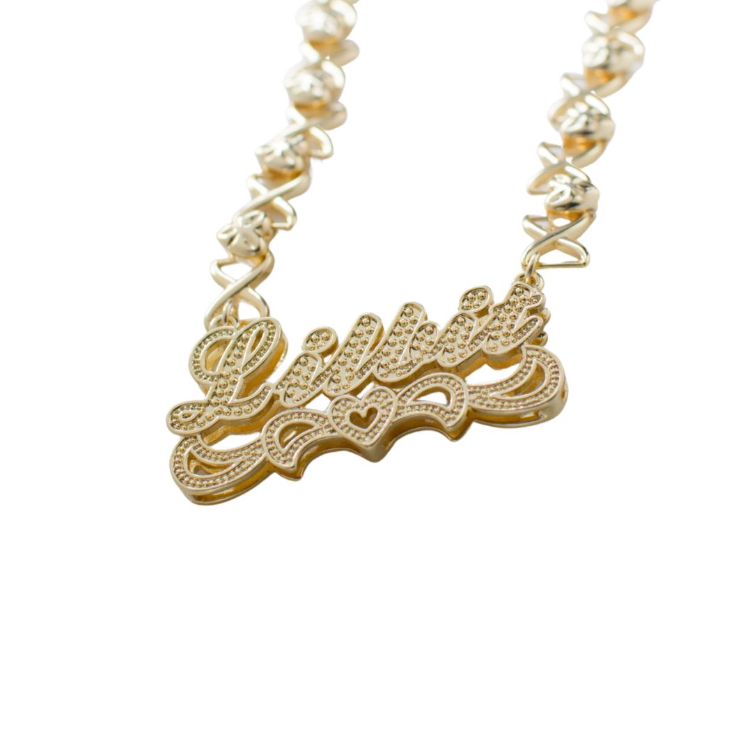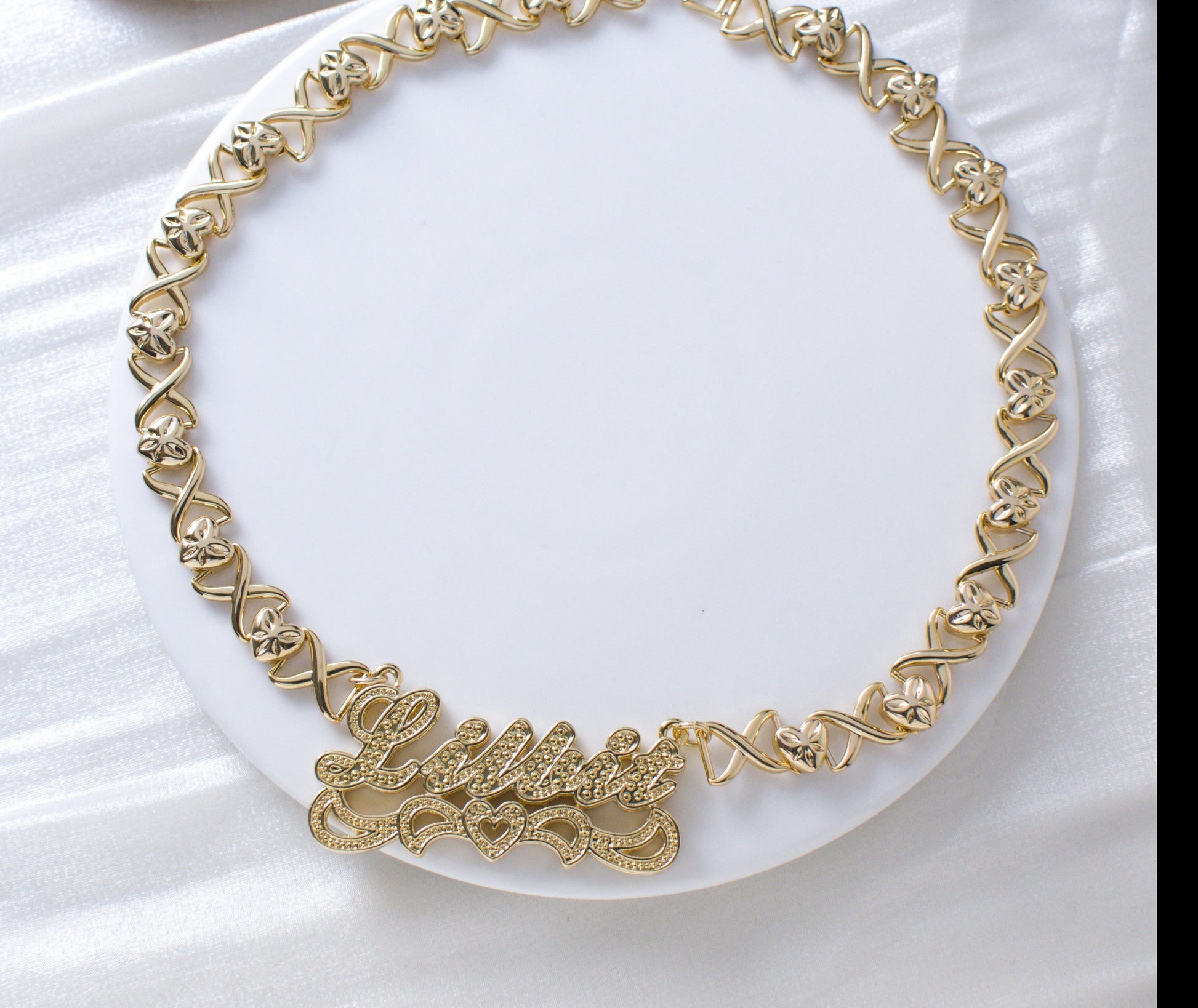 Not plated once, but twice. Add a bold and sassy edge to the way you accessorize with this custom piece. This beautifully crafted statement necklace is sure to take your look to the next level. This stunning addition is double processed and plated with 18K gold, rose gold, or silver, and completed with an infinity heart chain. Perks? You'll never have to worry about this necklace tarnishing or losing its quality.