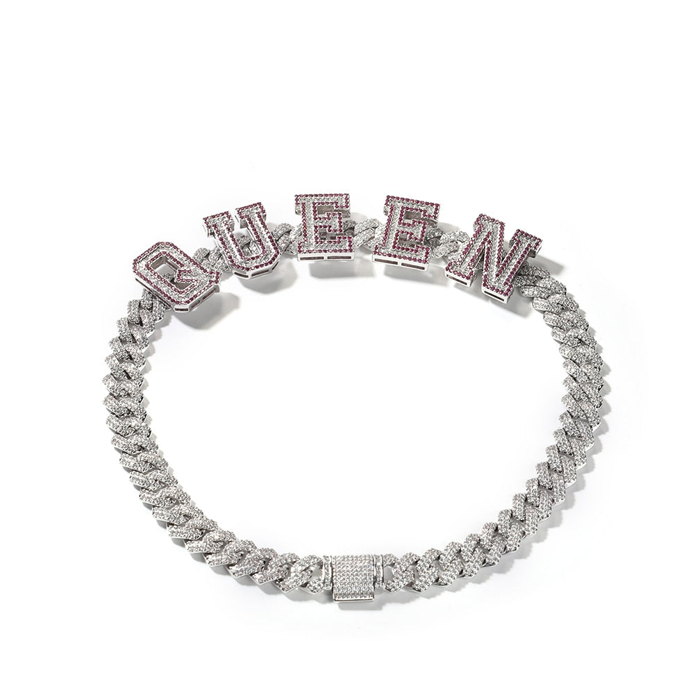 Personalize this high-quality luxury chain with any name or phrase 6 letters or less. Customize this design in 18K gold, rose gold, or platinum. Each necklace is set with heart-shaped precision cut glass crystals and hand polished to a pristine shine.