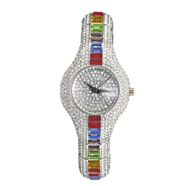 The perfect bling to complete your next look. Set with rainbow crystal baguettes surrounded by heart-shaped precision cut crystals this hand-polished masterpiece is sure to catch the eyes. Choose to have your order processed and plated with 18K gold or platinum over 304 stainless steel. You'll never have to worry about this bangle tarnishing or losing its quality.
