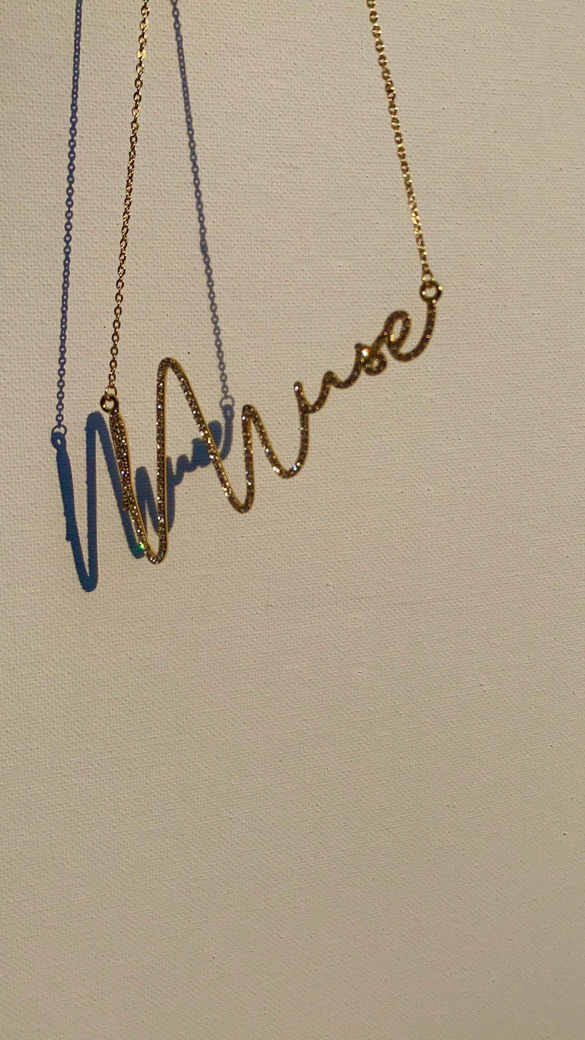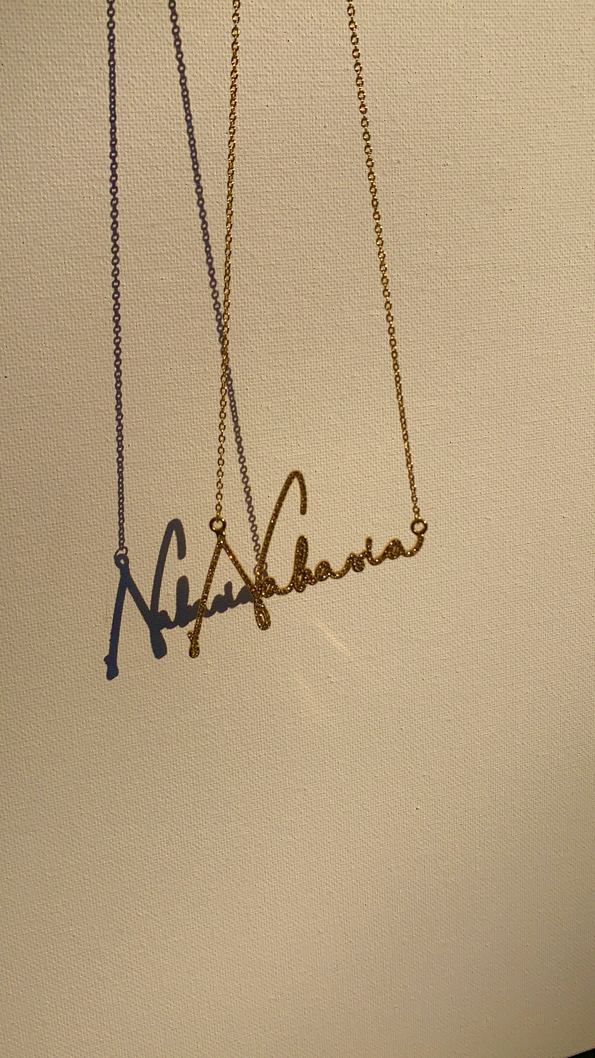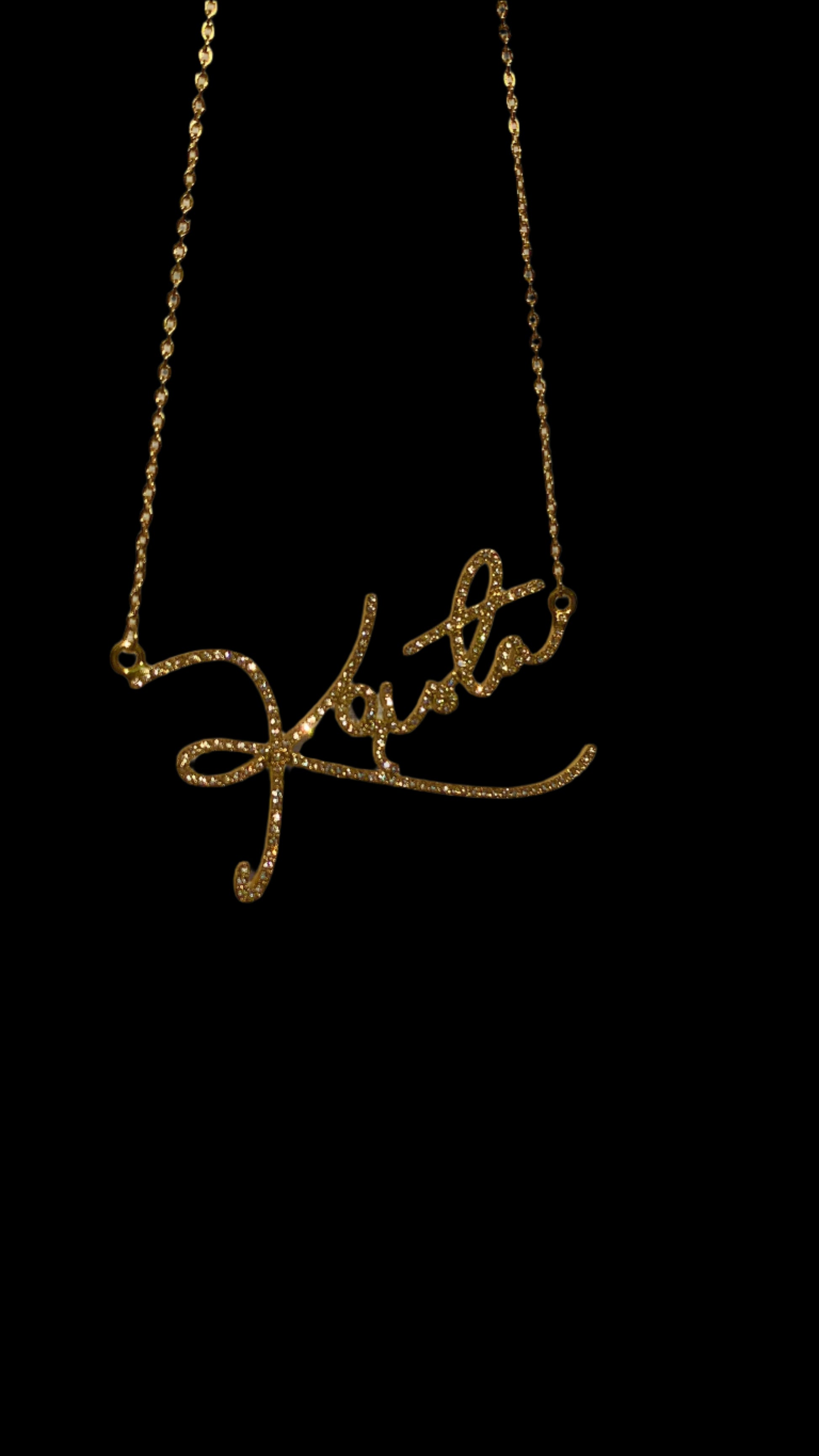 Your new favorite piece! Add this pristine masterpiece to your jewelry collection today! Customize this luxury necklace with any name or phrase that you hold dear. Available metal colors include 18K gold, rose gold, or platinum. Each necklace is set with CZ stones or pure Swiss AAA crystals, and hand polished to dazzling shine. Our stone types differ in refractive index. Our Swiss crystals refract more light than our CZ stones. Check out the difference in our photos of this piece. Customizations can be crafted in the horizontal or vertical orientation.Â