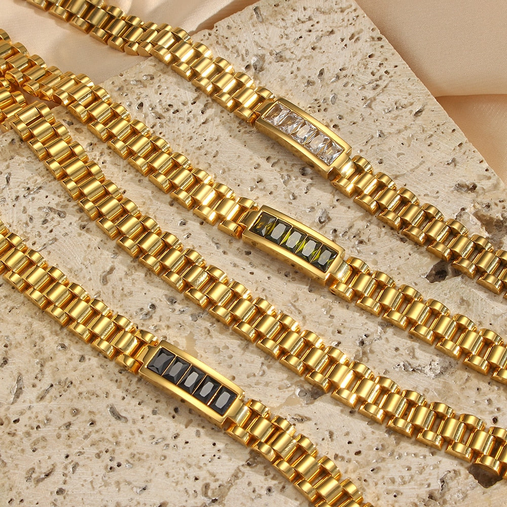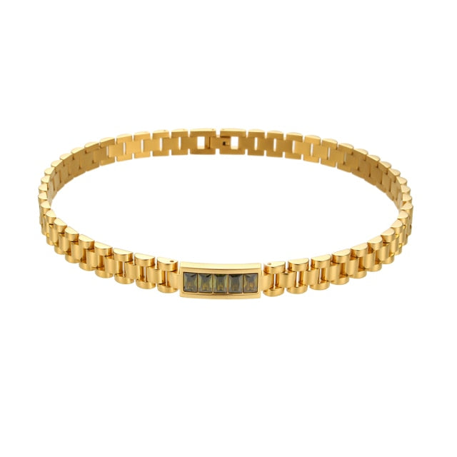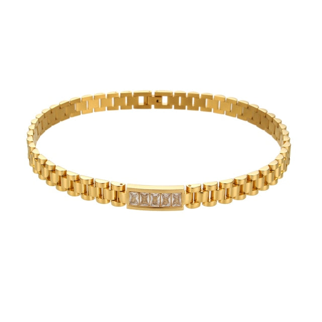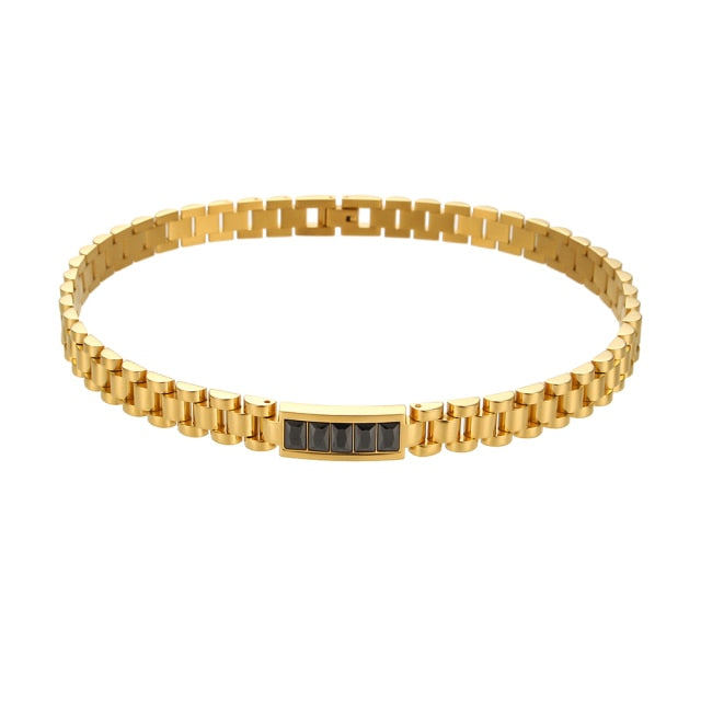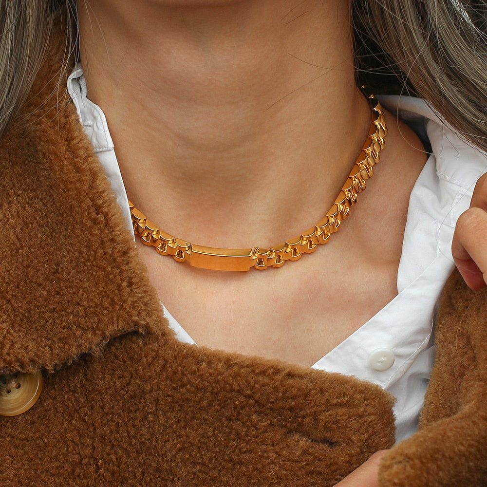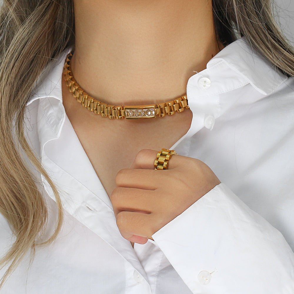 Your new favorite accessory muse. Add a sleek and edgy flare to your next look with our brand new MUSE Watchband Choker. This piece features a minimalistic option and four other embellishment options for you to shop from. Choose to keep it simple, or have yours embellished with a gold plate or stone (see available color options below). Each order is processed and plated with 18K gold over 304 stainless steel. You'll never have to worry about this choker tarnishing or losing its quality.