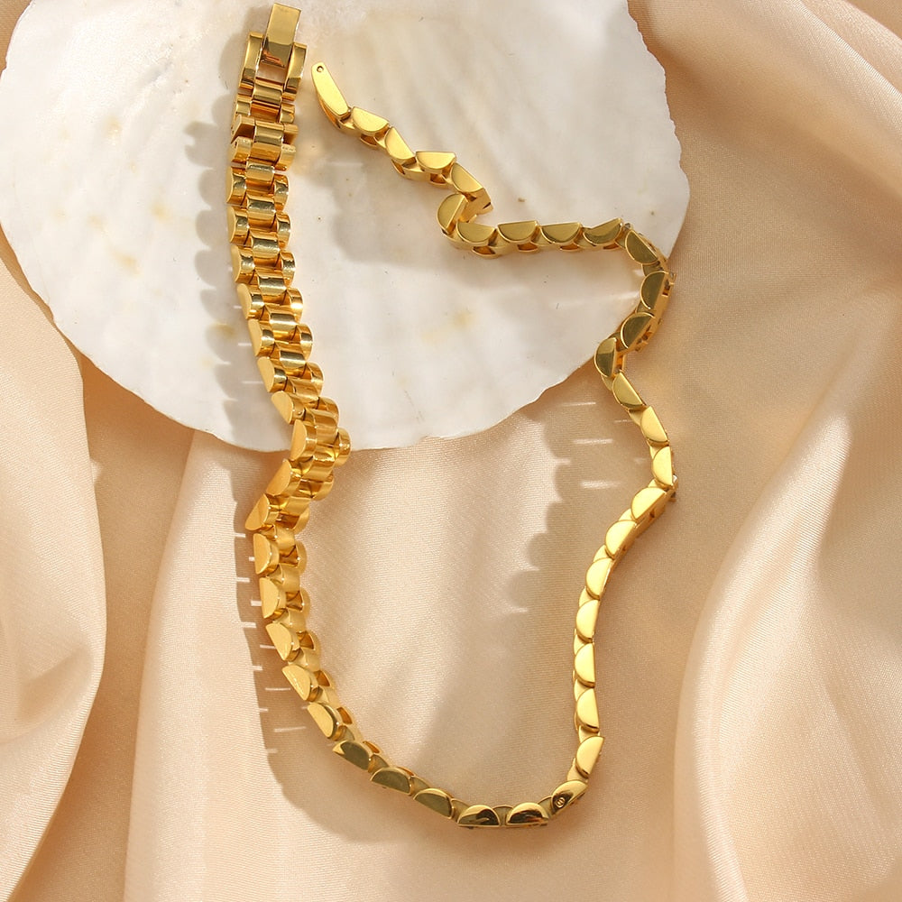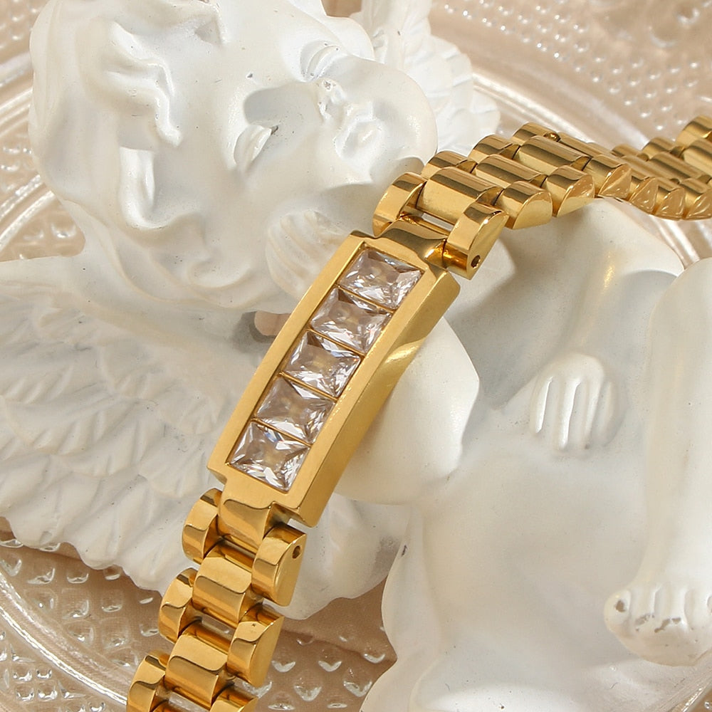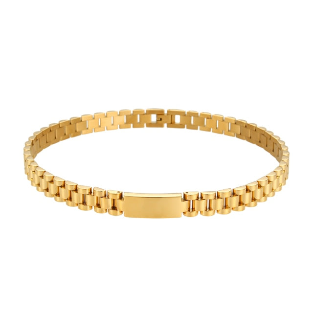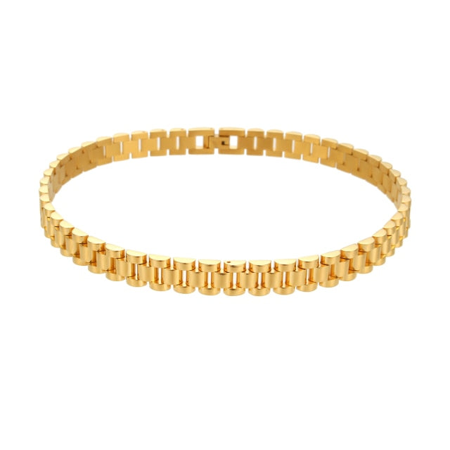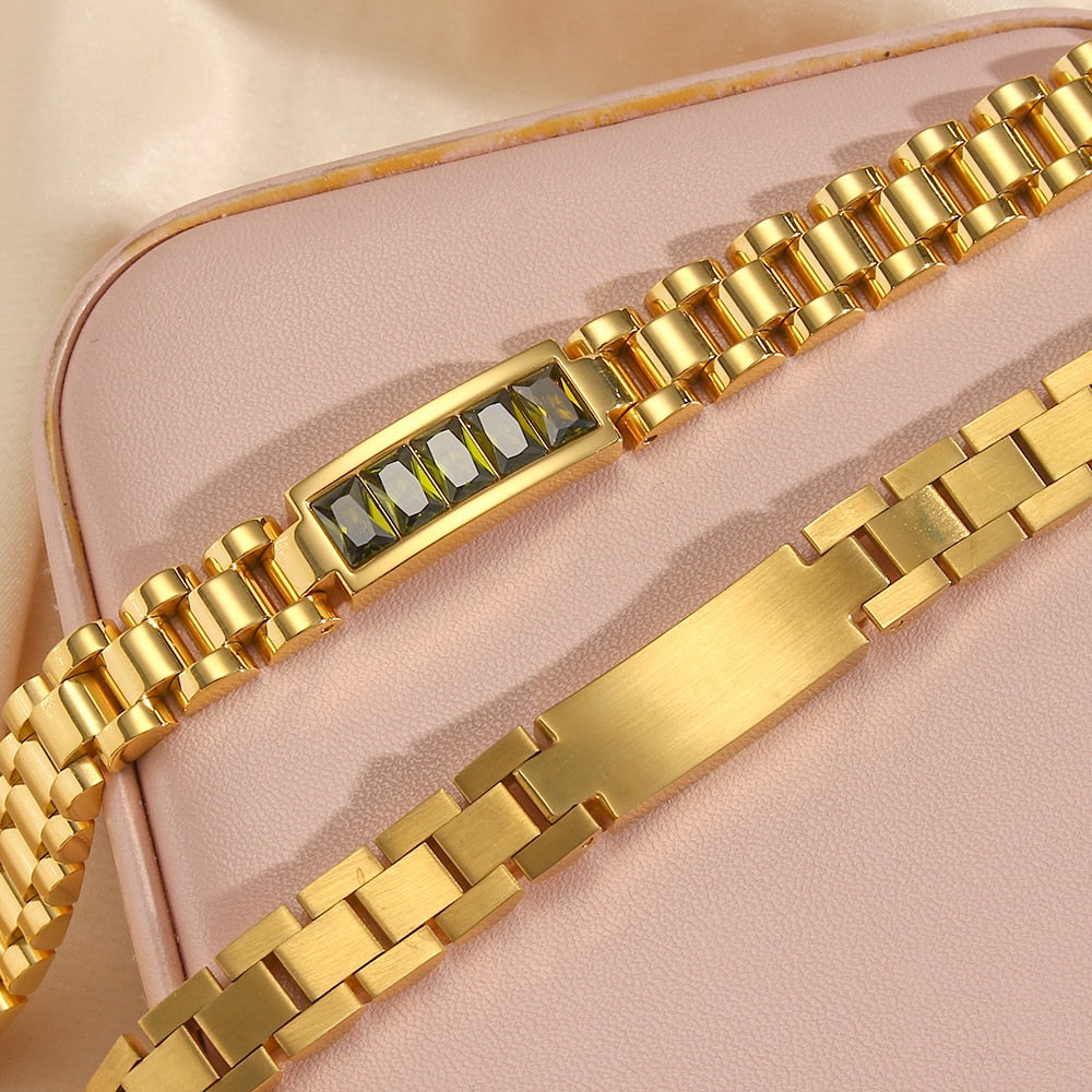 Your new favorite accessory muse. Add a sleek and edgy flare to your next look with our brand new MUSE Watchband Choker. This piece features a minimalistic option and four other embellishment options for you to shop from. Choose to keep it simple, or have yours embellished with a gold plate or stone (see available color options below). Each order is processed and plated with 18K gold over 304 stainless steel. You'll never have to worry about this choker tarnishing or losing its quality.